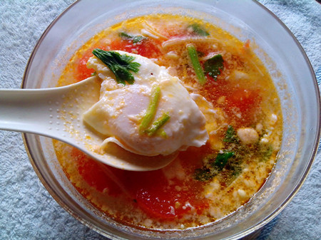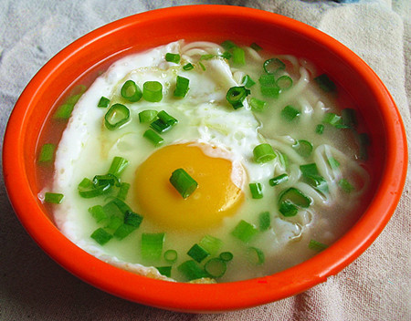 做 法:1)准备好主辅料2)锅里水烧开下面条煮熟,煮面条同时把小葱切成葱花3)锅烧热,放油,打入鸡蛋,关小火慢慢烘熟,煎荷包蛋4)高汤打开放入碗中 5)兑入适量开水搅拌均匀6)面条捞出7)倒入高汤拌匀8)放入荷包蛋撒上葱花,喜欢酸的放点醋,滴上香油,美美的开吃吧