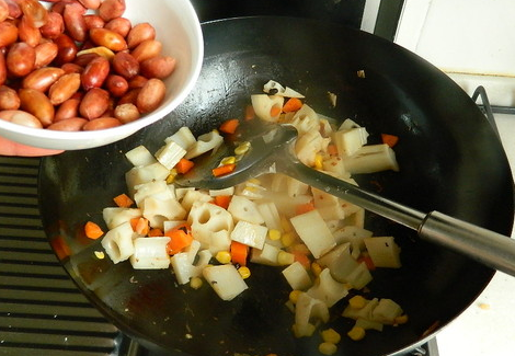 6.最后把油炸花生米加里边翻炒入味,可以适当加点水