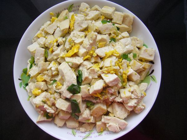 1)把豆腐切成2厘米的小块,淡盐水浸泡10分钟(防止炒碎)