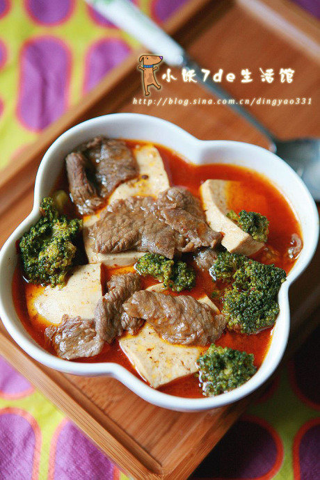 2,起锅,用葱姜蒜炝锅,然后放约20粒花椒,炒出香味放入两大勺郫县豆瓣酱炒出红油然后添水,水开后放少量的糖和花椒粉,再放入一勺鸡精,因为已经放了酱所以不需要放盐,调匀后放入豆腐,转中火煮10分钟,然后将味好的牛肉一片一片的放到锅中,转大火3分钟放入西兰花就做好了。