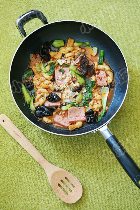 材料:午餐肉,木耳,干豆腐结,白菜,油菜,葱,姜,蒜,陴县豆瓣酱,花椒,辣椒粉,花椒粉,鸡精,糖,酱油