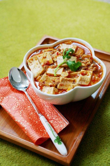 配料:豆腐,牛肉碎,姜末,蒜末,陴县豆瓣酱,酱油,糖,鸡粉,花椒,辣椒,花椒粉