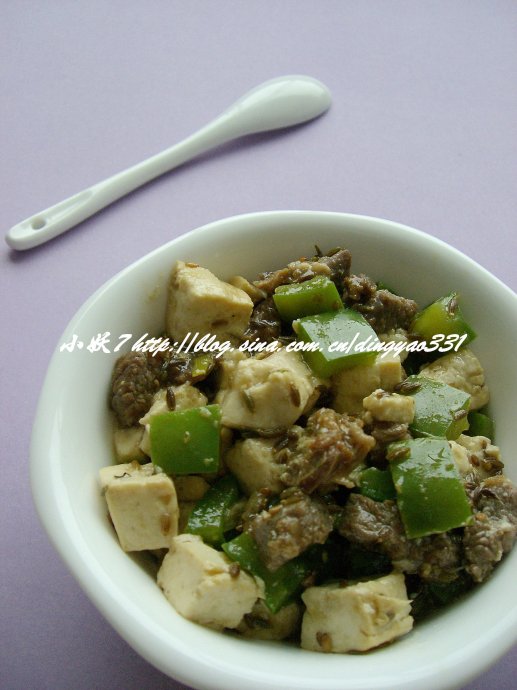 2,起锅,放入姜丝爆香,然后放入羊肉翻炒,炒到羊肉变色加入孜然炒出香味后,放入豆腐丁和青椒丁翻炒1分钟,调入少量的盐就可以出锅了!