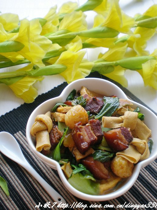 这个菜的做法其实就不用我多说了,就是把做好的红烧肉盛出,然后在里面放上你喜欢的青菜和干豆腐结,豆腐泡,煎好的虎皮鹌鹑蛋,炖上15分钟就做好了。