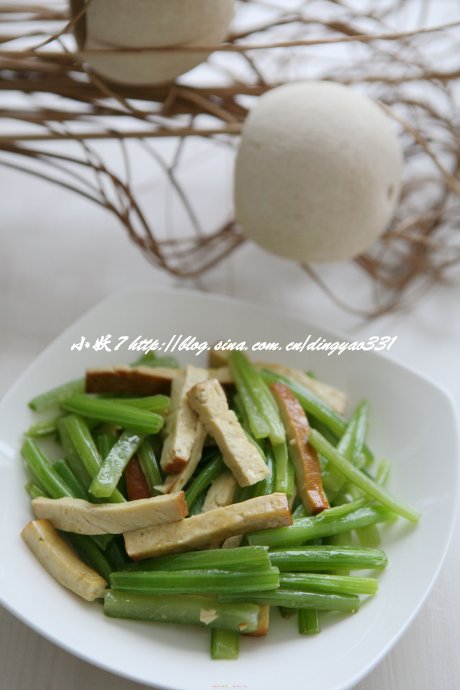 2,起锅倒油,油热放葱花爆香,然后放素鸡翻炒半分钟加芹菜翻炒1分钟,加入盐,少量的糖和鸡精炒匀就做好了。