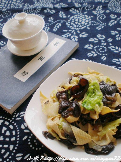 材料:白菜,木耳,干豆腐,葱,猪肉,酱油,盐,鸡精,糖