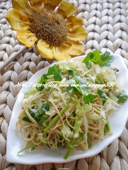 材料:白菜,干豆腐,粉丝,香菜,大蒜,辣椒油,盐,糖,味精,陈醋