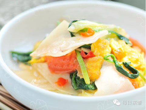 1将干饵块放入清水中泡软。西红柿洗净后切块,白菜洗净后撕成1口大小,菠菜洗净。