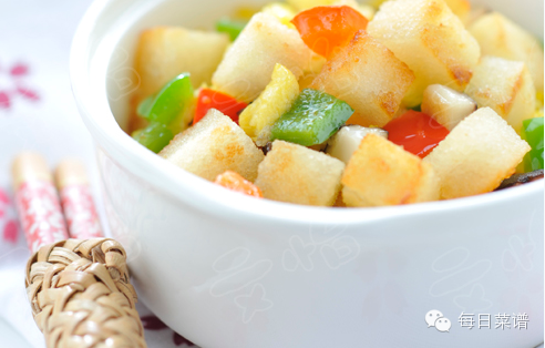 4锅中留少许底油,放入香菇丁,炒软后,加入青红椒丁,炒30秒,再放入鸡蛋和煎好的馒头丁。加盐,白胡椒粉,炒匀盛出即可。
