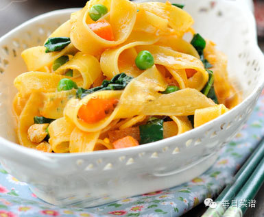 2平底不粘锅中倒入油,大火加热,待油温5成热时,放蒜末炒香后,放胡萝卜丁炒熟,然后放入切好的菠菜段(4cm),煮好的面条,放入辣椒酱和番茄酱炒匀。