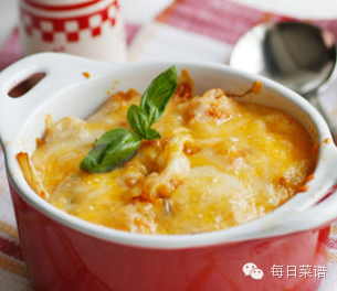 4将炒好的辣白菜米饭放入焗碗中(高度为焗碗的3/4即可),在饭的表面撒上一层马苏里拉奶酪丝,放入预热好的烤箱,用180度的温度,烤约12-15分钟即可。