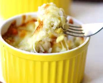 8、放入烘焙碗中,上面撒上马苏里拉芝士