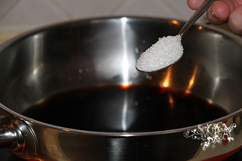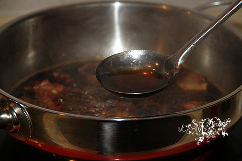 7. 加入适量米醋,继续煮至汤汁浓稠,排骨上色即可。
