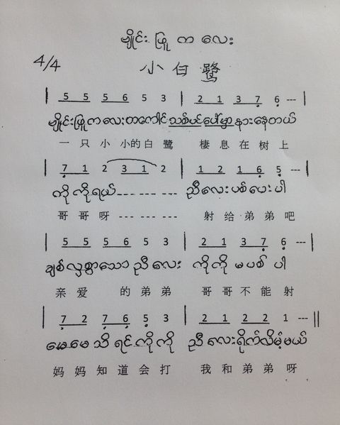 请阅附件:缅甸歌谣“小白鹭”缅文及中文翻译