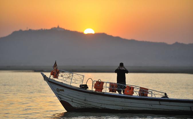 河道很美,在夕阳下很美,静谧地,悠远地流动着。河边有人家,江上有船,沿岸有山、树林、稻田和白鹭,还有颤动的西阳紫霞和慢悠悠的生活节奏。大战时的足迹没有了,那时缅华作家黄绰卿带着家眷和一批文友,曾在这瓦城江边等船上溯至八莫,那种彷徨惊恐已毫无痕迹。此刻,伊洛瓦底江只有安详,仿若母亲在哄摇篮里刚刚要入睡的孩子时的那种安静和状态,所以江上江边所有生命,包括江边旅行的我,都恬静地呼吸着江河飘来的微风。
