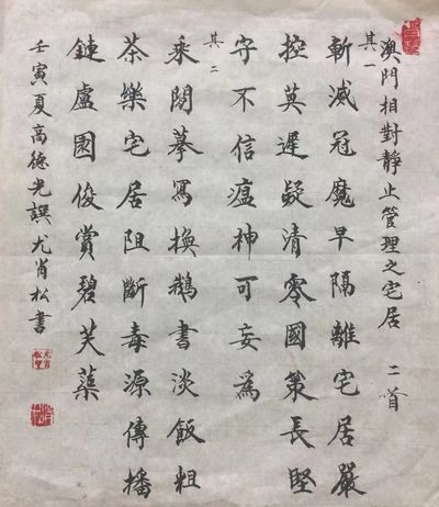澳门相对静止管理之宅居(二首)的书法家:(文/德光,书法/尤端阳,练子明,何丽婵,尤肖松,吴仕明)
