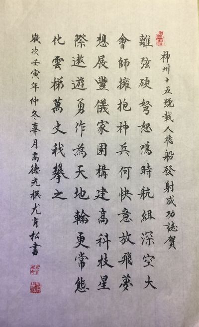 神舟十五号载人飞船发射成功志贺(文/德光,书法/茂松,黄玉灵,尤肖松,阮伟生,岑建平,练子明,蔡惠琼,黄伟华)