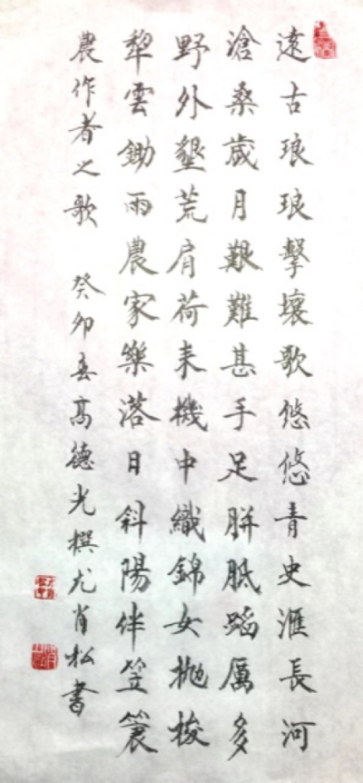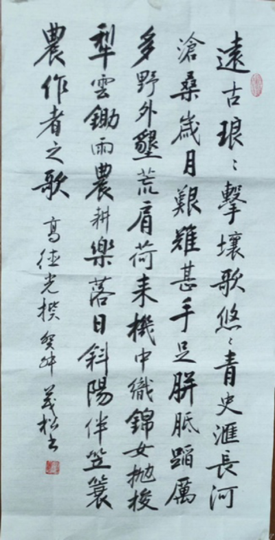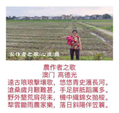 远古琅琅击壤歌, 悠悠青史滙长河。 沧桑岁月艰难甚, 手足胼胝蹈厉多。 野外垦荒肩荷耒, 机中织锦女抛梭。 犂云锄雨农家乐, 落日斜阳伴笠簔。