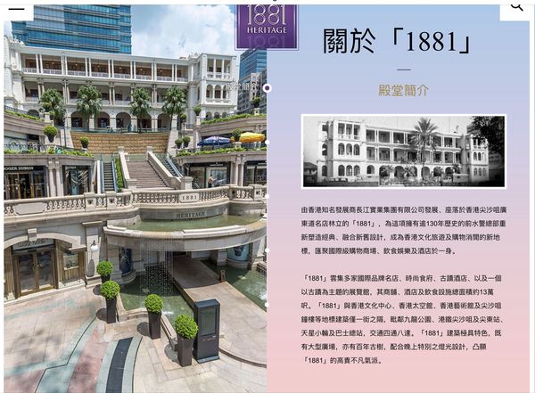 【注】「一八八一」位于香港九龙尖沙咀广东道二号,原址系前水警总部主楼、马厩、时间球塔、九龙消防局及九龙消防局宿舍五幢建筑。其外貌古典而大气,有具国际级品牌商铺、老香港独特风貌酒店及展览厅,为香港文化旅游休闲新地标。因建于1881年而得名。