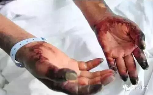 结果到中午11点左右,手脚、脸上全部发黑变肿,脸部黑紫,还有血泡,呼吸困难。疼的满身是汗,话都说不出来。