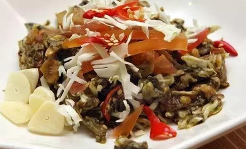 将发酵好的茶叶与卷心菜、蒜末、小米椒、花生、蚕豆等拌在一起,味道极为丰富而富有层次,集苦、酸、辣、香、咸于一身,是缅甸人最爱的小食之一。这道菜百搭,它既可以是一道小吃,一碟开胃菜,也可以和一盘米饭搭配在一起成为一顿饭。