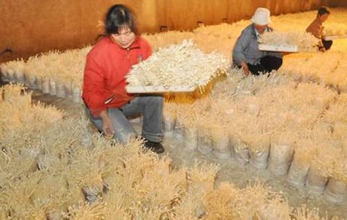 金针菇是无需农药、肥料的纯绿色食品,其生长过程中的营养全部由菌包供给;菌包选用棉籽壳、玉米芯、木屑等作原料,将这些原料加水拌匀,装袋、高温灭菌后就可以进行接种了,在操作过程中灭菌必须彻底,以防止杂菌污染。