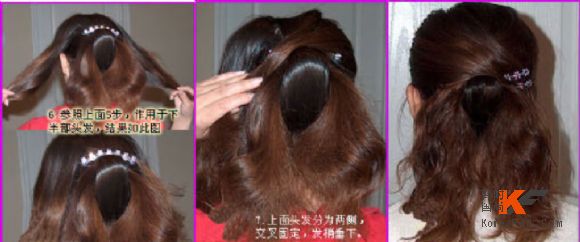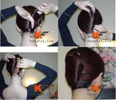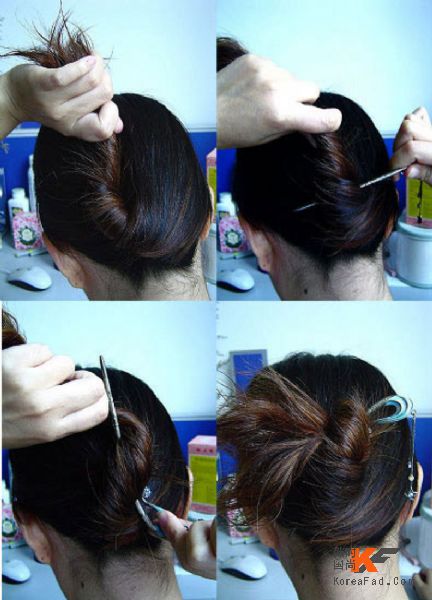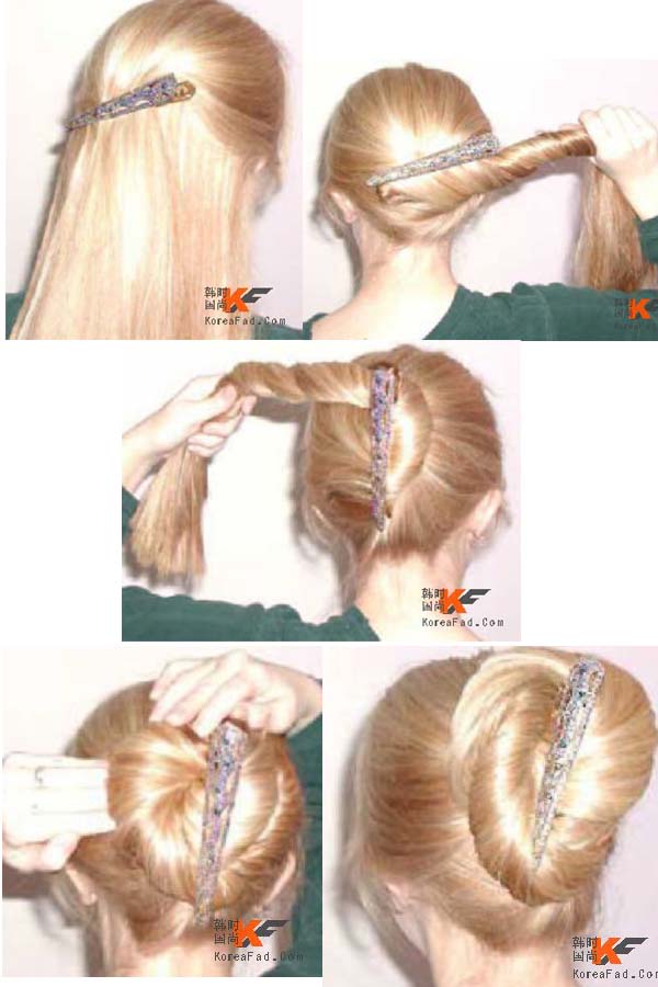 1. 将头发挑一束在中间,用鸭嘴夹夹住 2. 将所有的头发拧紧,顺时针放向旋转至紧 3. 旋紧后的头发逆时针放向绕到鸭嘴夹上 4. 头发绕完鸭嘴夹,将发尾塞到里面,如果MM 头发多,要用一个小发卡固定 5. 成型