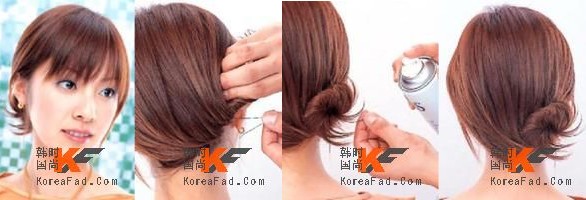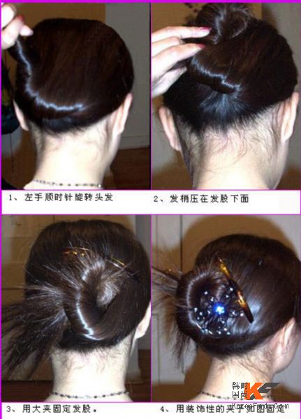 1. 将头发束起,从左往右转,把手放在头发中间定位 2. 头发旋紧,一直绕进去,好象包头发一样 3. 用梳子把头发理顺,并可以帮助头发绕紧 4. 用发卡固定好后,加几颗漂亮的小发饰。