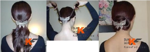 1. 将头发用蝴蝶发卡全部束起来 2. 把头发均分成两束,分别旋紧,绕在蝴蝶发卡的翅膀上 3. 头发交叉绕在蝴蝶翅膀上,用小发卡固定,成型了