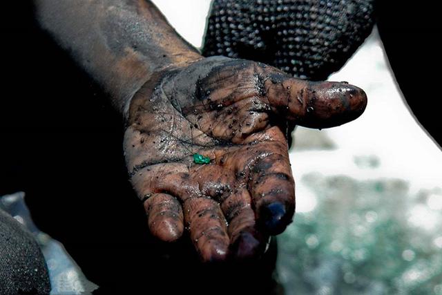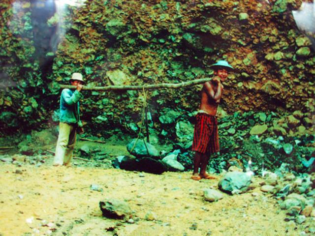 2.山洞子——大多在旱季,三五成群的挖玉人,结伴上山寻矿,选定目标后,用最原始的工具像打井一样向地下深掘,挖到石头后,若石头较小就用吊筐将小石头运至地面,仔细挑拣分辨;若石头较大,就引水到洞底进行冲刷,冲去泥土后再细心判断是否翡翠。