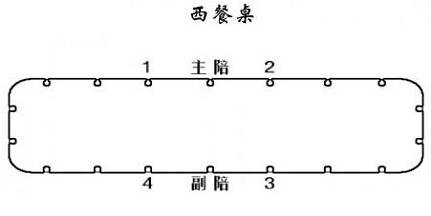 正式宴会座位的排列:通常安排每桌10人,来宾的位置以离主人座位的远近而定。我国习惯按各人本身职务排列,以便于谈话。当只有一位主人时,1号来宾坐在主人右手的一侧,2号来宾坐主人左手的一侧,3、4、5、6、7、8、9号等来宾依次分别坐在两侧。当有两位主人时,即有第一主人和第二主人时,1号来宾坐在第一主人右手的一侧,2号来宾坐在第一主人左手的一侧,3号来宾坐在第二主人右手的一侧,4号来宾坐在第二主人左手的一侧,5、6号来宾分别坐在1、2号来宾的两侧,7、8号来宾分别坐在3、4号来宾的两侧,其他来宾依此排座。