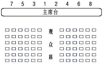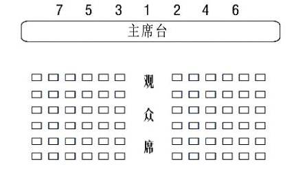 主席台的排列。当主席台人数较多时,可设立1排以上的主席台,领导分排就座。以面向台下来看,当主席台人数为单数时,1号人员居中,2号人员在1号人员左手位置,3号人员在1号人员右手位置,以此类推。当主席台人数为双数时,1号人员在中心点偏右的位置,2号人员在中心点偏左的位置,即1号、2号人员之间的中心点即为主席台的中心点,3号人员在1号人员右手位置,4号人员在2号人员左手位置,以此类推。