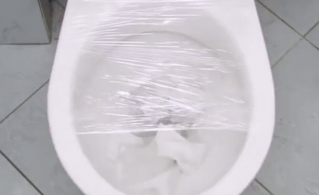 冲一次水,保鲜膜就会鼓起来,然后我们再按下去。