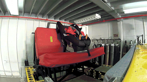而同样的速度撞击,脱掉羽绒服的假人被牢牢地固定在座椅中,只有轻微的回弹出现,并没有滑脱。