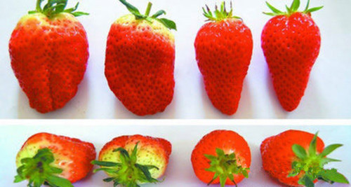 2、左边两颗过量使用激素的草莓靠近把儿的地方是白色的,这些草莓上色不均匀,光泽度差,果柄处颜色发青发白,其实就是催大的果实。而右边两颗自然生长的草莓颜色均匀、红艳,光洁度好,一看就很有食欲,而且这种圆锥型的小草莓都很香的,那种催熟的草莓香味很淡,不知道大家有没有发现过!