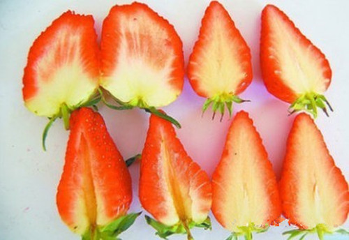 3、左边4块就是使用了过量激素催大的草莓,对比来看,这种草莓空腔现象比较多、空腔大,果肉颜色发白,上色很差。右边4块自然生长的草莓一看就知道果肉饱满,内部果肉呈鲜红色,而且几乎没有空心的!!