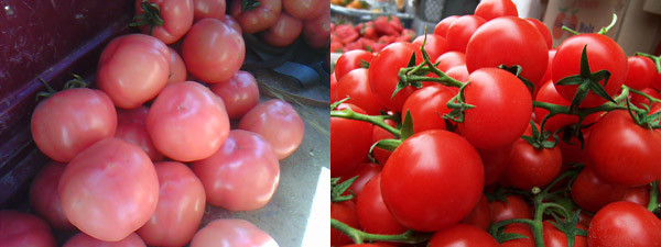 买番茄,首先要明确生吃还是熟吃。如果要生吃,当然买粉红的,因为这种番茄酸味淡,生吃较好;要熟吃,就应尽可能的买大红番茄,这种番茄味浓郁,烧汤和炒食风味都好。(下图中左边为粉红番茄,右边为大红番茄)