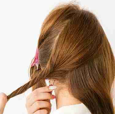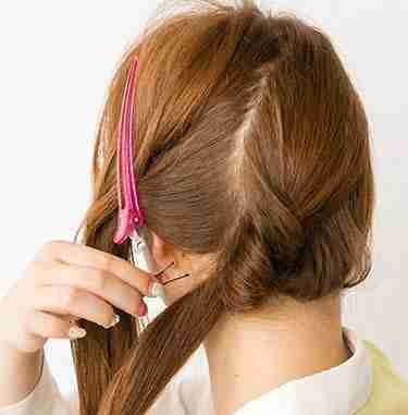 step1:首先将头发大致分为斜着的三区,将前面的一束头发用发夹固定,把中间的头发进行叫扭转后用发夹固定到发根处。