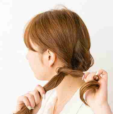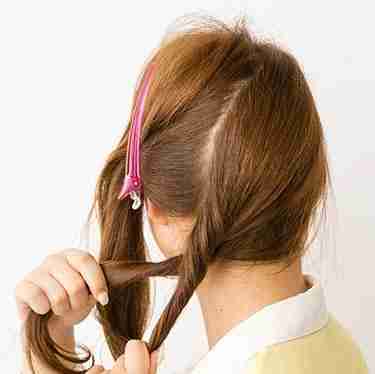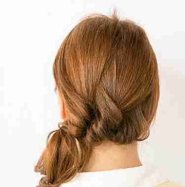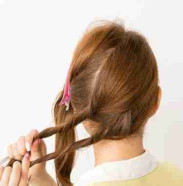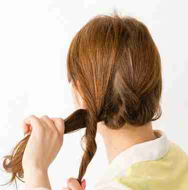 step5:将头顶的一束头发放下后进行扭转,将第三束头发拉倒下面。