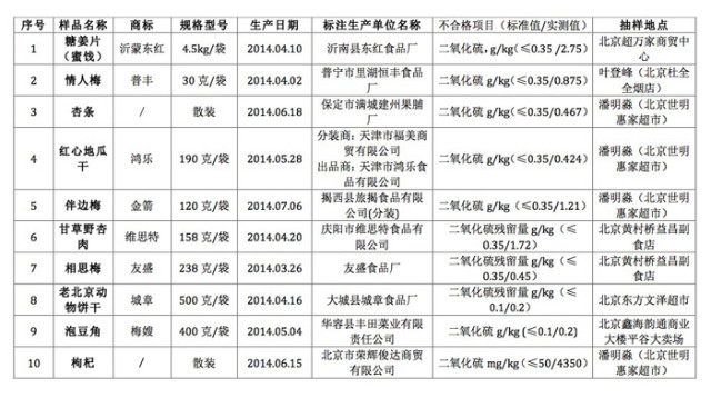 北京市下架二氧化硫超标食品名单