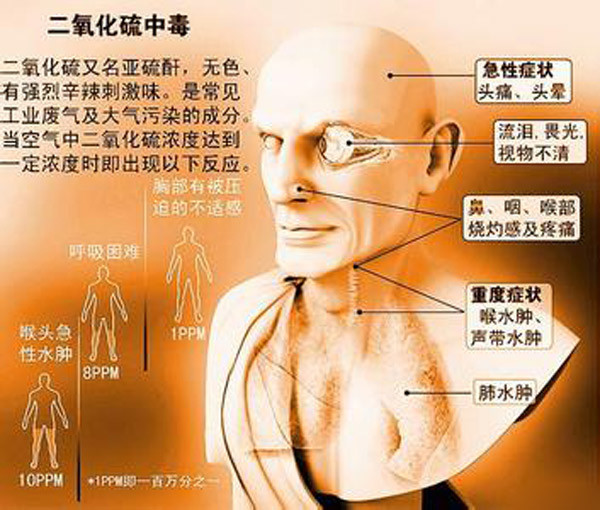 据了解,一般来讲,二氧化硫随着食品进入体内后生成亚硫酸盐,并由组织细胞中的亚硫酸氧化酶将其氧化为硫酸盐,通过正常解毒后最终由尿排出体外。因此,少量的二氧化硫进入机体可以认为是安全无害的。但超量则会对人体健康造成危害。急性二氧化硫中毒可引起眼、鼻、黏膜刺激症状,严重时产生喉头痉挛、喉头水肿、支气管痉挛。经口摄入二氧化硫的主要毒性表现为胃肠道反应,如恶心、呕吐。