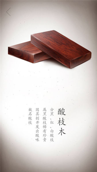 酸枝木大体分为三种:黑酸枝、红酸枝、和白酸枝。它们的共同特性是在加工过程中发出一股食用醋的味道,故名酸枝。在三种酸枝木中,以黑酸枝木最好。其颜色由紫红至紫褐或紫黑,木质坚硬,抛光效果好。有的与紫檀木极接近,常被人们误认为是紫檀,唯大多纹理较粗。