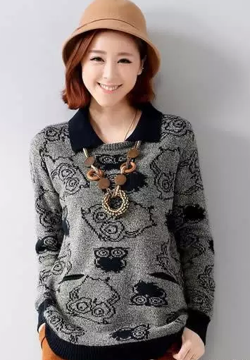 猫头鹰图案娃娃领针织毛衣