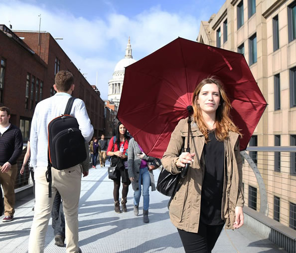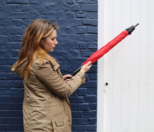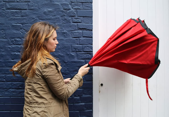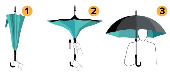 设计师列举传统伞造成的各种不方便,如收伞需要大空间,进车子前就得先收,非得在车门外淋几秒钟的雨,等把伞收好人也湿透了。雨水到处滴,进到室内伞端的雨水不断滴滴滴,难看又可能把鞋子弄湿,在车内也会把椅垫沾得到处都是水。另外大雨通常伴着狂风,这伞还可以防强风。