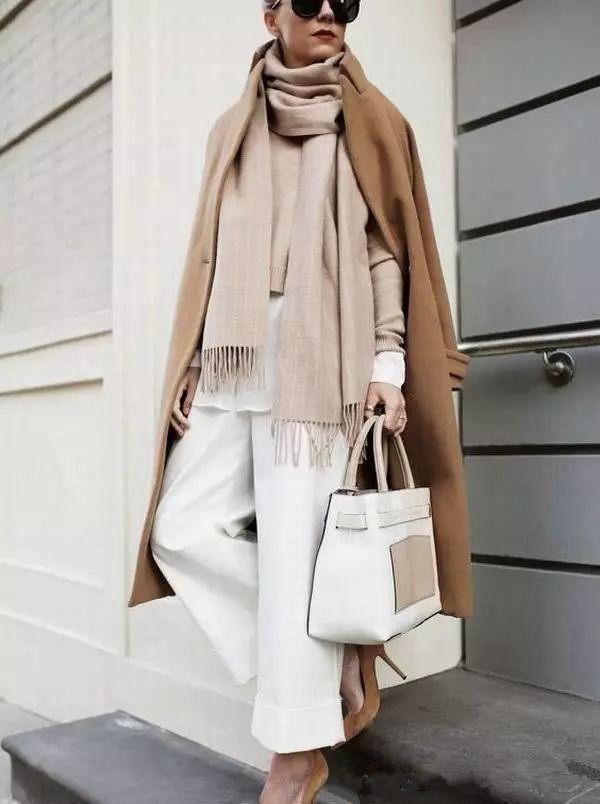长款大衣搭配阔腿裤,也是这几年时髦girl们冬天的必备公式,小个子女生可以选择八九分长度的阔腿裤,露出脚踝。