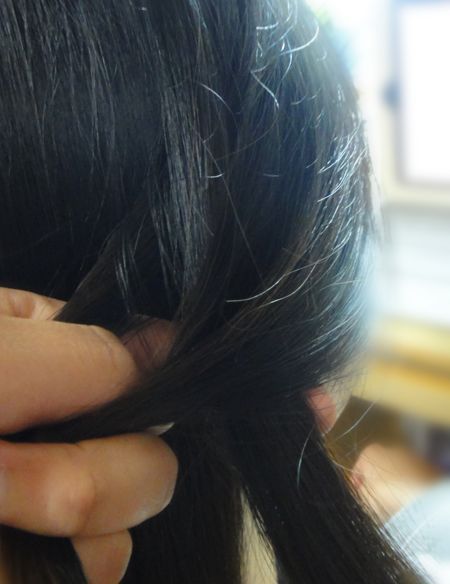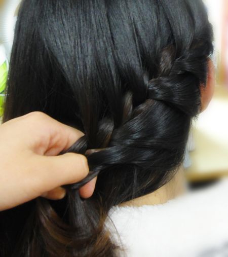 第四步:将蜈蚣辫编发到下图位置用黑色隐形皮筋扎住。