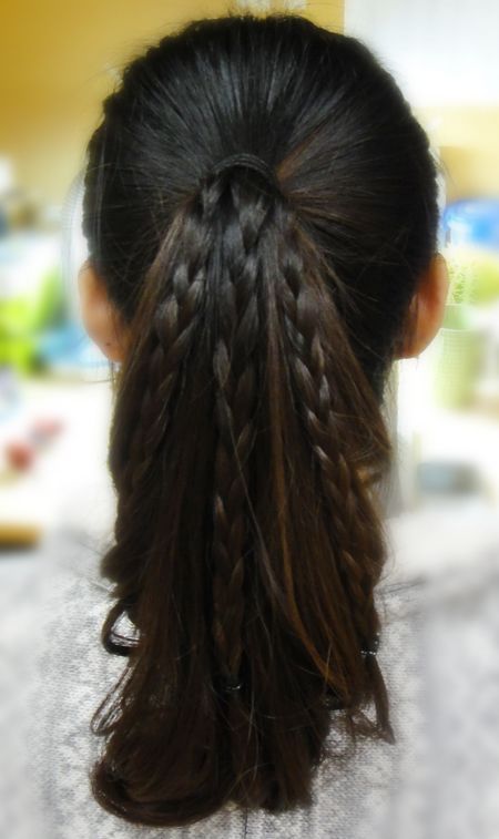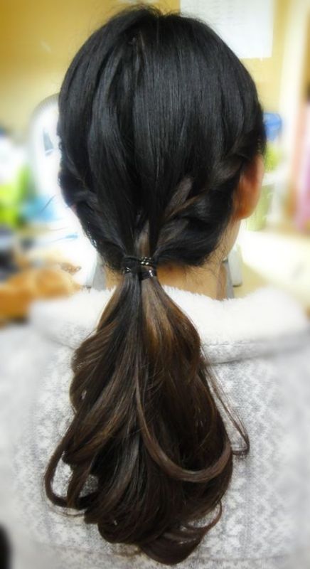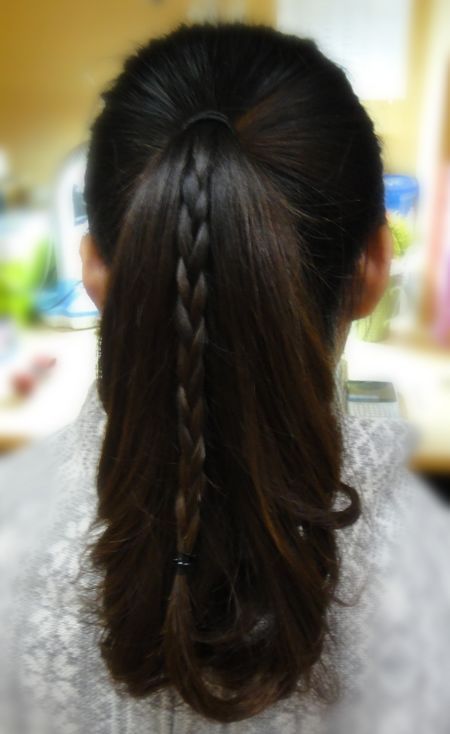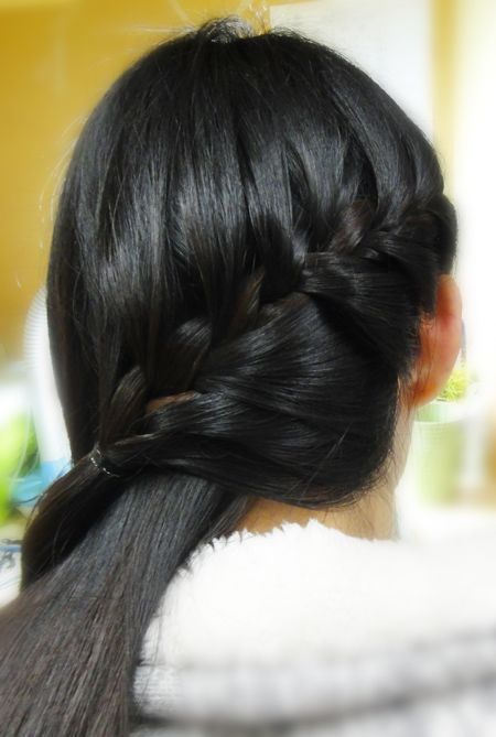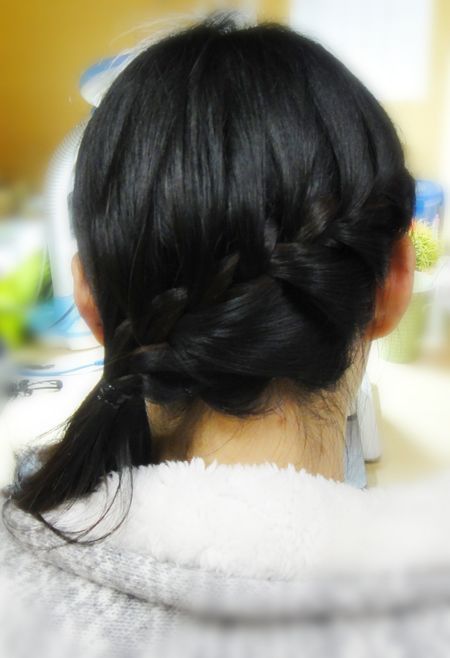 第二步:将头发编到下图位置用皮筋扎住就可以了哦。
