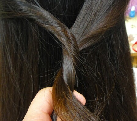 第二步:在左侧也取同样的发量扭起,然后将两侧的头发扭到中间。
