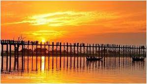 位于曼德勒市区以南约11公里处的阿马雅布雅曾是贡榜王朝的都城。这里的景点最著名的当属世上最长的柚木桥—乌本桥了,也称为“情人桥”。这座桥建于1851年,呈“之”字形状。在这儿我们可以看到全世界最美的晚霞。每天的傍晚黄昏时分,这儿总会聚着很多的游客和一些摄影爱好者。