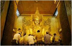 穆罕摩尼佛是位于曼德勒市中心的一座著名的寺院。每天清晨,僧人和信众都会很虔诚地为佛像洗脸,供献清水、食物、鲜花和香烛。在这儿,男人们可以到佛像旁给佛像贴金,女人则不允许进入,只能在外围远远地跪拜。